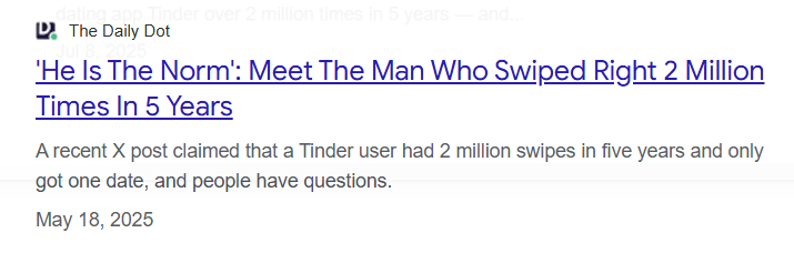 I’m sure you’ve seen the headlines and story posts of studies averaging 100-200 swipes before you match - and that’s not even factoring how many of those matches may yield a date. Then there’s reels of women saying they’ve logged onto their male friends profiles as a means to talk for them, only to discover the harsh reality that it’s really fucking hard regardless of your sex.